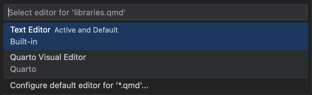 You can also right click a .qmd document in the file explorer and select the Open With… command, which will prompt you for the editor to open the file with: